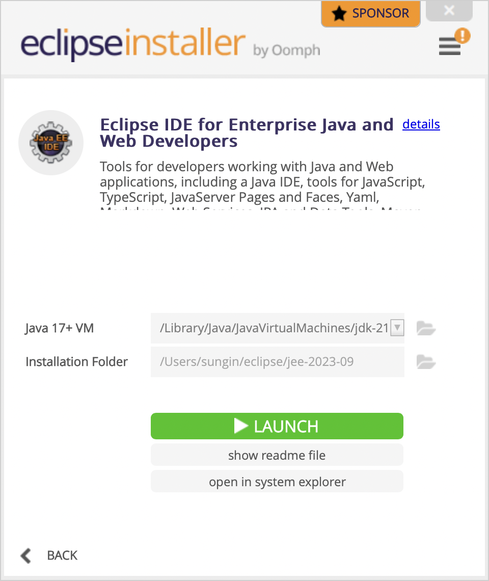 인스톨이 완료되면 위와 같이 LAUNCH 버튼이 활성화되고, 디렉터리를 설정하라고 나온다.