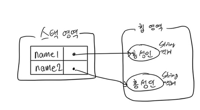 자바는 문자열 리터럴이 동일하다면 String 객체를 공유하도록 되어있다. 만약 아래와 같이 name1과 name2가 동일한 문자열인 "홍성인"을 참조할 경우, name1과 name2는 동일한 String 객체를 참조하게 된다.