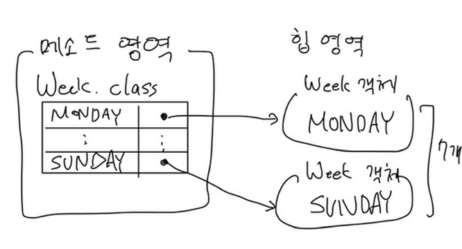 그리고 메소드 영역에 생성된 열거 상수가 해당 Week 객체를 각각 참조하게 된다.